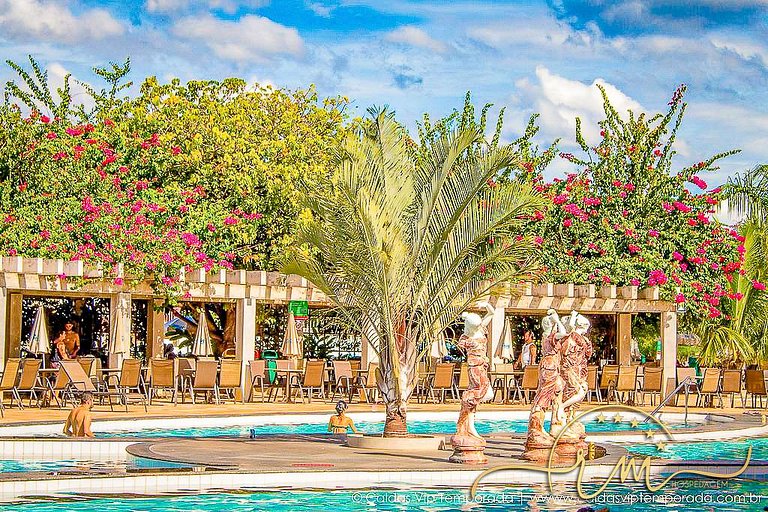Condomínio com: Parque aquático 24h (02 piscinas funcionam á noite) Entretenimentos do condomínio possui horários alternados, confirme durante sua estadia, na recepção 12 piscinas quentes e frias, sendo algumas: 01 piscina de onda 01 piscina semiolímpica 02 piscinas com bar molhado 06 ofurôs com hidromassagem Rampa e tobogã adulto e infantil Cascata Sauna Duchas Ampla área de banho e sol Restaurante e lanchonete Espaço gourmet Sala de jogos (alguns jogos pagos) Brinquedoteca Cinema Berçário Fraldário Sala de ginástica Wi-Fi TV a cabo Serviço de camareira Garagem para um veículo de passeio