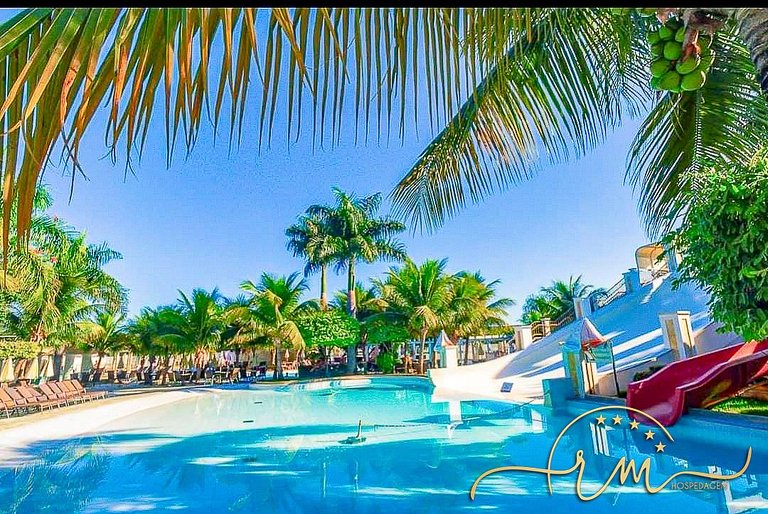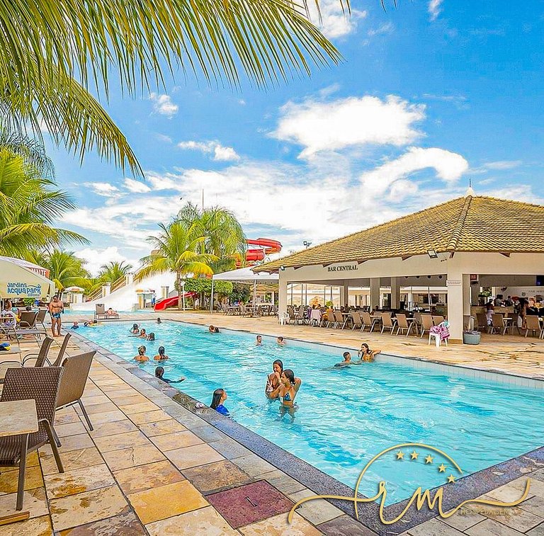 Condomínio com: Parque aquático 24h (02 piscinas funcionam á noite) Entretenimentos do condomínio possui horários alternados, confirme durante sua estadia, na recepção 12 piscinas quentes e frias, sendo algumas: 01 piscina de onda 01 piscina semiolímpica 02 piscinas com bar molhado 06 ofurôs com hidromassagem Rampa e tobogã adulto e infantil Cascata Sauna Duchas Ampla área de banho e sol Restaurante e lanchonete Espaço gourmet Sala de jogos (alguns jogos pagos) Brinquedoteca Cinema Berçário Fraldário Sala de ginástica Wi-Fi TV a cabo Serviço de camareira Garagem para um veículo de passeio