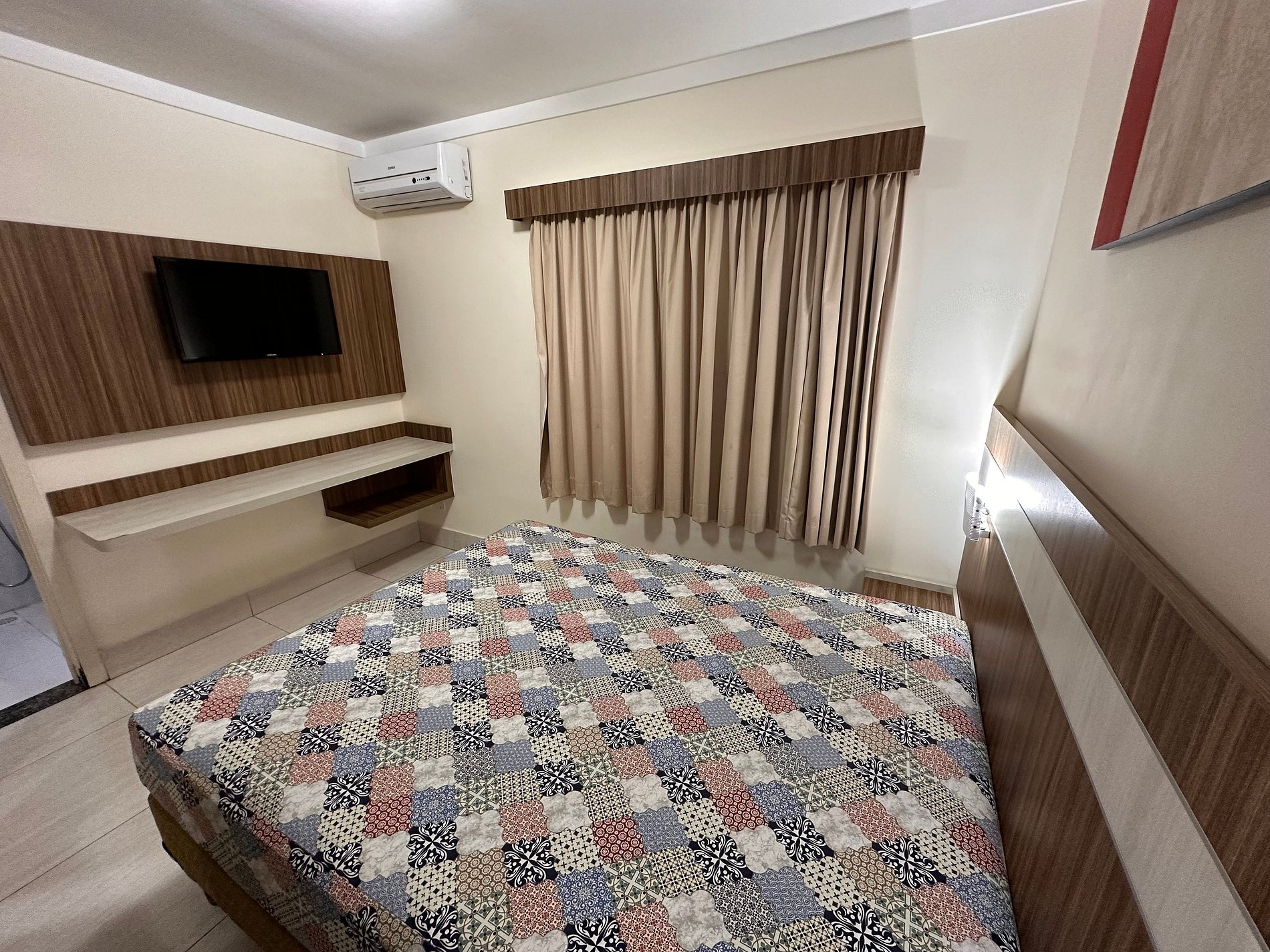 Suíte de casal com TV e ar condicionado.