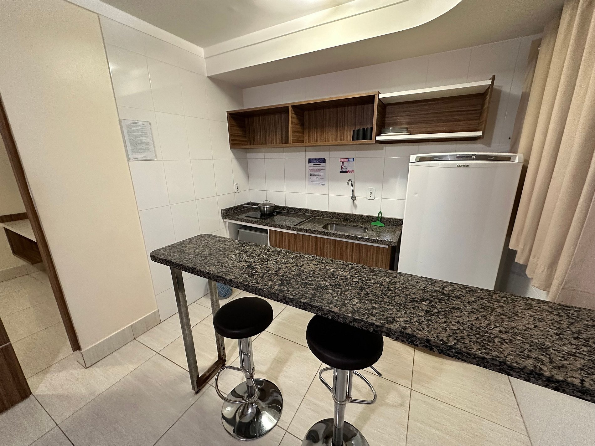 Cozinha compacta com geladeira, microondas.