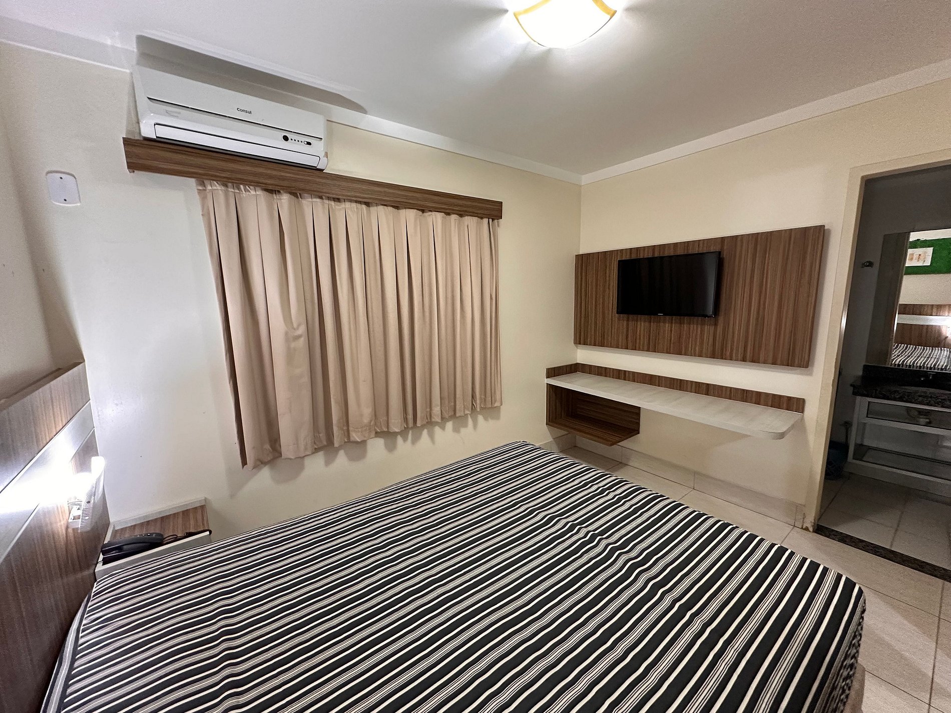 Suíte de casal com TV e ar condicionado.